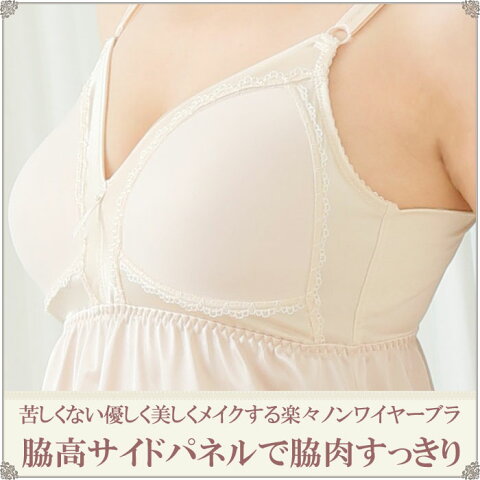 ギフト対応 ブラキャミソール カップ付き スリップ ランジェリーの説明 脇に食い込まないから太って見えにくい脇高折り返しモールドカップ付きノンワイヤーブラ。